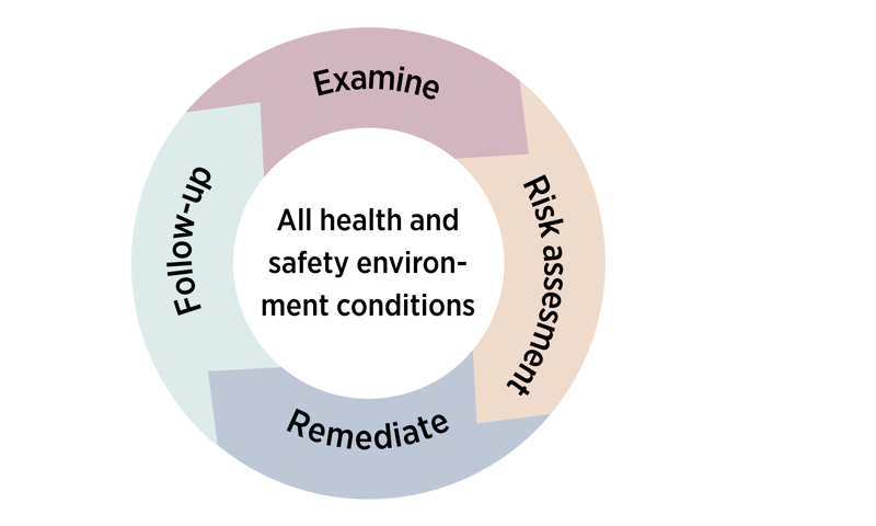 Systematic work environment management is often described as a wheel, i.e. it is a constantly ongoing process in four steps: examine, risk assessment, remediate, and follow-up. Therefore, the wheel is a good tool for including dom violence in the existing systematic